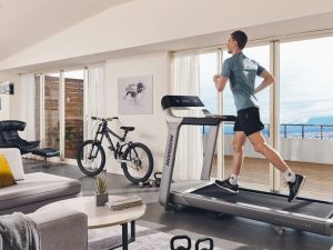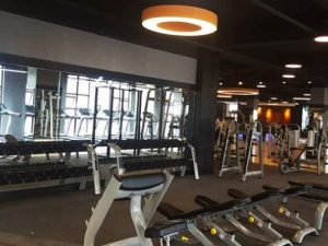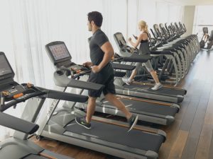 有氧器材的左右间距应在40厘米以上,便于健身教练站在器械旁指导客人科学地使用。跑步机后部距离其他器械应留出至少120厘米的安全距离。有氧器材应尽可能临窗摆放,并配置电视机,弥补锻炼时的枯燥。
